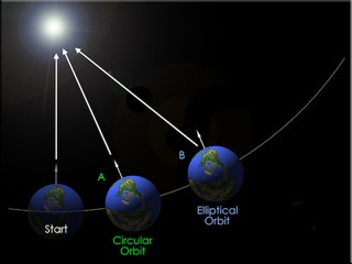 Notice that the green colored Earth travels around the sun in a perfect circle. Its speed never varies. The blue colored Earth travels around the sun in an ellipse. Its speed is greatest in January when it is closest to the sun. Its speed is slowest in July when it is farthest away from the sun.