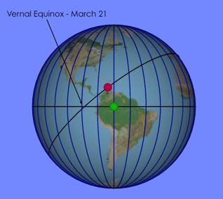 Let’s go inside of the celestial sphere and watch the path of the True Sun from the Earth as it makes its way around the celestial sphere. Again, the point of view is from the equator looking directly overhead at noon.