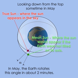 Looking at the top view, observe the position of the True Sun and the Mean Sun on the celestial sphere. From the point of the observer on the equator, the True Sun is slightly offset from the Mean Sun. Looking at the bottom view on the right, as the sun moves during the day from East to West, the True Sun has already passed overhead, ahead of the Mean Sun by about 2 minutes.