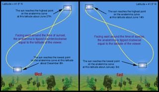 Have you ever looked at a rise and set time chart of the sun and noticed that in the summer in the northern hemisphere the earliest sunrise and latest sunset do not occur on the longest day of the year? Or that in the winter the latest sunrise and earliest sunset do not occur on the shortest day of the year? This phenomenon is directly related to the shape of the analemma.